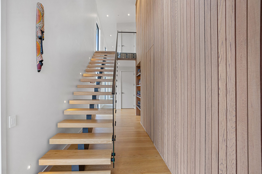- Used for the internal stair and landing, continuing the frameless aesthetic indoors.