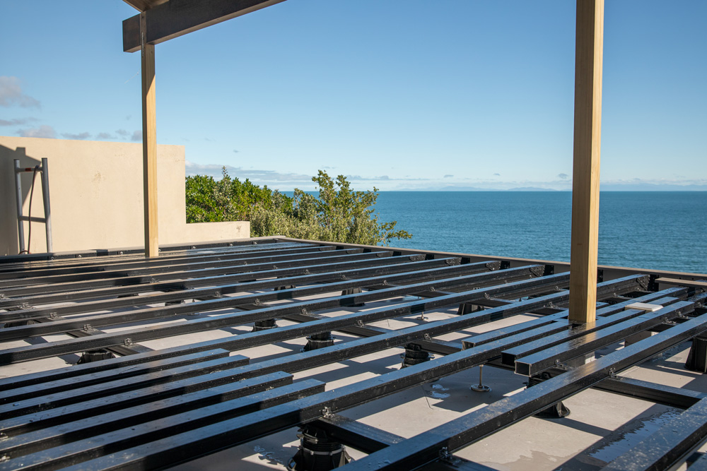 The homeowner wanted a large, low-maintenance outdoor area that felt connected to the home while maximising the coastal outlook. With no ability to fix the structure back to the building due to waterproofing and architectural constraints, a floating deck system was the only viable solution.